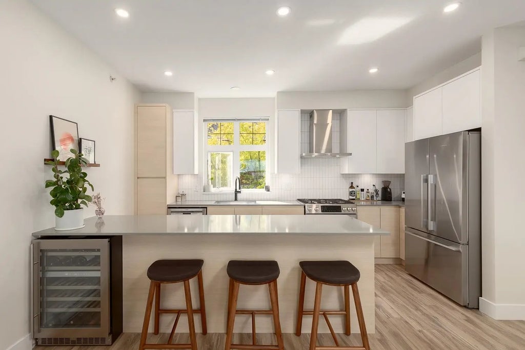 Welcome to this 2-bed, 2-bath townhome at The Vantage, a highly sought-after boutique complex in Mt. Pleasant, with unobstructed views of the North Shore mountains. The upper level is designed for entertaining with open living/dining, vaulted ceilings, and a kitchen fully redone in 2021 with Fisher & Paykel + Bosch appliances, extended island, and a gas stove. A skylight brings natural light year-round, while the patio extends the living space outdoors. On the main level, the primary bedroom offers a luxurious ensuite, along with a second bedroom, full bath, laundry, and under-stair storage. With one parking stall and two storage lockers, this turnkey home offers a perfect blend of modern living and everyday functionality. Across the street from Mt. Pleasant Elementary, and Guelph park.