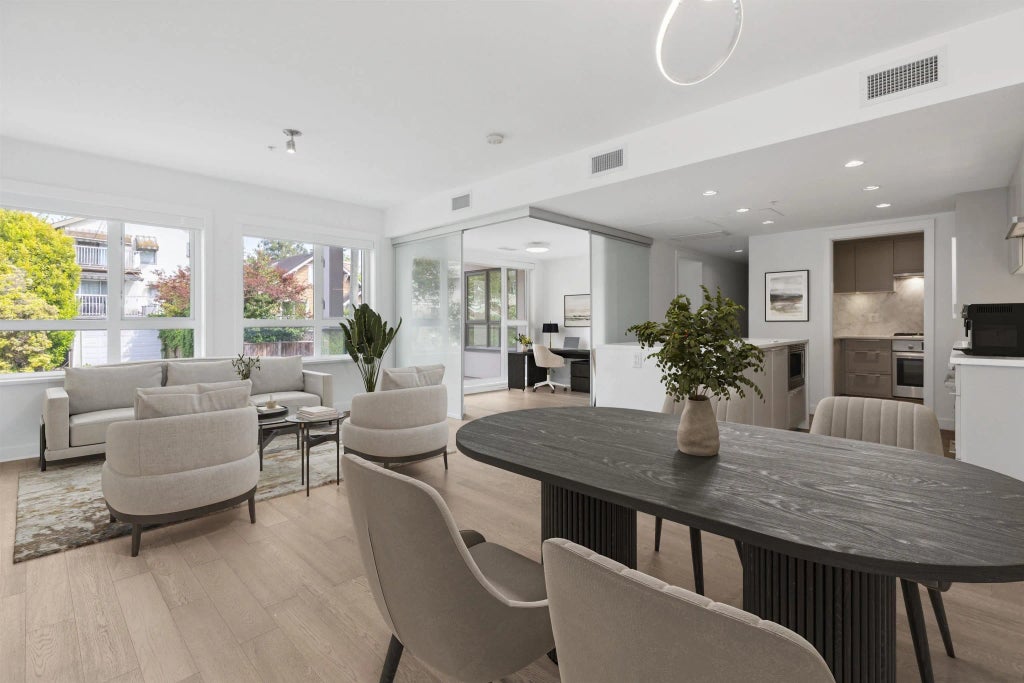 Welcome to the The Leveson - a boutique collection of 39 carefully crafted homes in the community of Marpole. This 2 BED/2 BATH + DEN located on the QUIET SIDE of the building exudes charm / sophistication. Featuring an open-concept layout with floor-to ceiling windows, the interior boasts a contemporary design with impeccable details, including wide-plank engineered hardwood floors throughout, a gourmet kitchen with sleek Caesarstone quartz waterfall countertops, marble backsplashes, and premium integrated Bosch appliances. This unit is also one of only two in the complex that includes a WOK KITCHEN-a rare and valuable feature! Den can be used as guest bdrm. Conveniently located within walking distance to supermarkets, parks, schools etc. 1 parking/1 storage locker. OPEN HOUSE SEP 28, 1-3