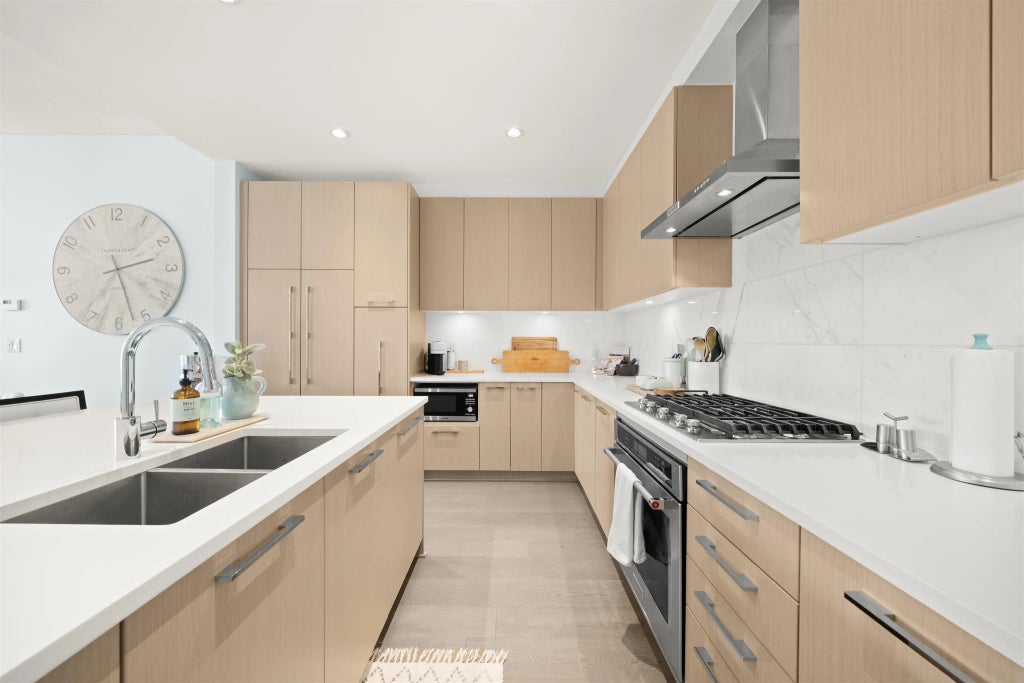 Discover unparalleled luxury in Ladner's premier waterfront enclave,Pilot House.This 2 bed/2 bath 1193 sq ft floorplan is an entertainer's dream,showcasing a stunning kitchen,soaring ceilings & an abundance of southern light that fills the space daily.The chef-inspired open kitchen anchors the home,featuring pro-grade SS appl,premium cab& oversized island that flows seamlessly into expansive living & dining spaces finished w/ luxury hw flooring. Bdrms are thoughtfully placed at opp. ends,each a generous retreat w/WIC. Primary bath w/ soaker tub, double sink+ shower. Modern comforts incl A/C, in-suite ldry, storage & sec prkg. Resort-style amens elevate daily life: outdoor pool, hot tub, elegant lounge, guest ste & sport crt. Steps to scenic trails, Captain's Cove Marina, dining & schools.