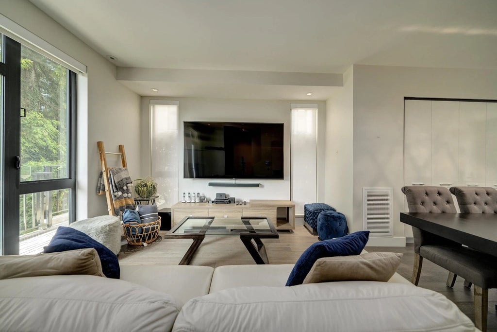 DETACHED and FURNISHED 3-story Townhouse with 1859 SF open plan. No shared walls. The finishes are contemporary and include; Bosch appliances, integrated cabinetry, 9' ceilings, engineered hardwood floors, heated bathroom floors, quartz counters, great storage, built-ins and central air-conditioning. The rooms are spacious and bright with large picture windows and contemporary window coverings. Outdoor spaces include; front entrance patio, large back patio and large balcony from primary bedroom. The patio access for kitchen to outdoor space is a wall to ceiling sliding system creating a full opening to kitchen and outdoor area.The basement features a large walk-in laundry and separate storage area - direct access to your parking.