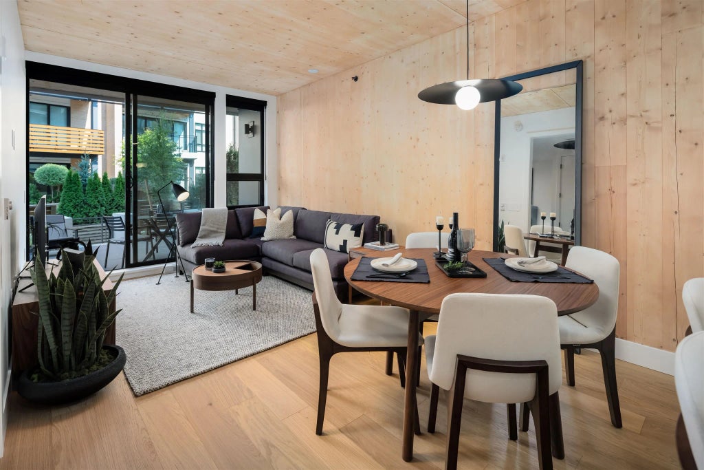 NEW PRICING & MOVE-IN READY! Welcome to Timber House by Aragon. This spacious 2 bed/1 bath ground floor home offers 940 SF of interior living space and approx 764 SF PRIVATE PATIO. Modern, high-design interiors feature exposed CLT panels, wide-plank oak floors, black roller blinds & A/C. The sleek kitchen offers full size Fisher Paykel + Smeg appliances, quartz counters, matte black hardware. Spa-inspired baths feature heated floors, floating vanities & frameless glass showers. Building amenities include: Courtyard, gym, BBQ area, dog wash, 1 parking (EV-ready opt), 1 storage. Steps to the boardwalk, 12 min to DT New West, 30 min to YVR, 35 min to DT Van. Photos shown may be from a display suite – not the actual unit. OPEN HOUSE EVERY SAT TO MON 1–4PM OR BY APPT.