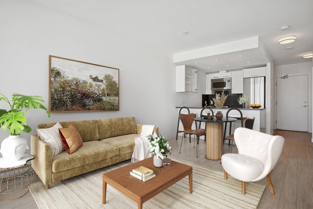 This is the one you've been waiting for! North Facing home with UNOBSTRUCTED WATER & MOUNTAIN VIEWS at Strathcona Village. One of the most desirable 1 bedroom floorplans with 619 square feet of living space, plenty of windows, and a balcony perfect for enjoying the beautiful views of the harbour & the North Shore Mountains. Gourmet kitchen with stainless steel appliances, tons of counter & cabinet space with bar seating, a Den/Solarium with window that is ideal to work from home & an extra office/flex room. Amenities include fitness centre, meeting rooms, landscaped rooftop terrace & even garden plots to grow your own fruits/vegetables. 1 parking included.