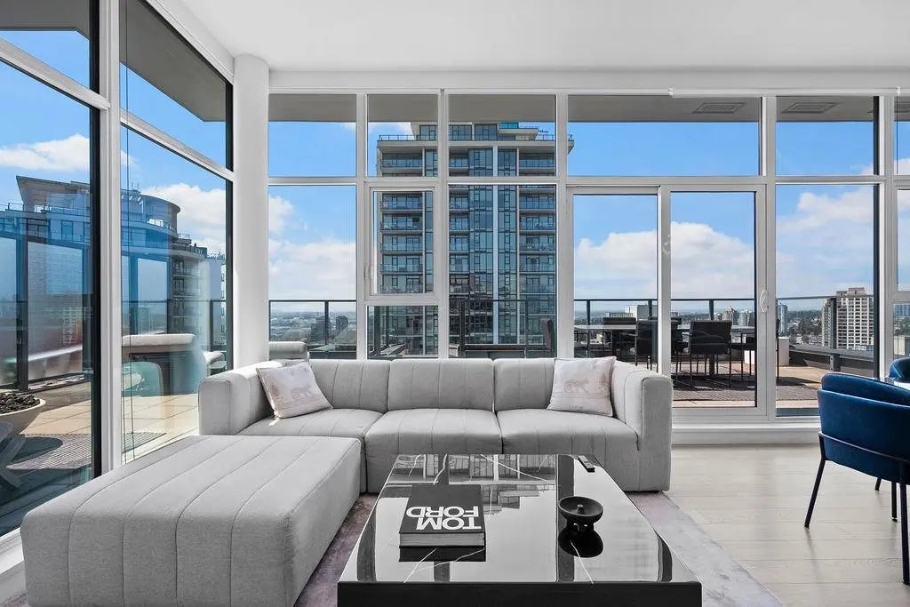 Penthouse Living with panoramic Views! This stunning 2 bed, 3 bath corner unit soars above the city with over 1200 sqft of private outdoor space and panoramic 270° views of the mountains, ocean, and skyline. Thoughtfully designed layout with two large bedrooms on opposite sides, each with its own ensuite bathroom, plus a stylish powder room for guests. The Cressey-built home features a chef’s kitchen with gas stove, heat pump with air conditioning, and over 1060 sqft of bright interior living. Premium amenities include basketball & squash courts, sauna, steam room, party room, two floors of gym facilities, & concierge. Includes 2 parking & storage. A rare opportunity to own one of Burnaby’s most impressive penthouse residences.