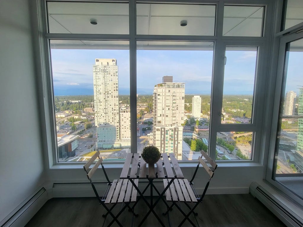 Welcome to One Central! Priced below BC Assessment! This stunning 2-bedroom, 2-bath corner unit includes 1 parking stall and a bike locker. Enjoy a bright, open layout with floor-to-ceiling windows, quartz countertops, stainless steel appliances, and a rare wraparound balcony showcasing 270° city and mountain views. Amenities feature a 44th-floor Sky Lounge, rooftop garden, gym, yoga studio, co-working space, dog park, and 24-hour concierge. Steps to SkyTrain, SFU, Central City Mall, restaurants, and Holland Park. Move-in ready with new home warranty! Open House 11:00 AM - 200 PM, Oct 13.