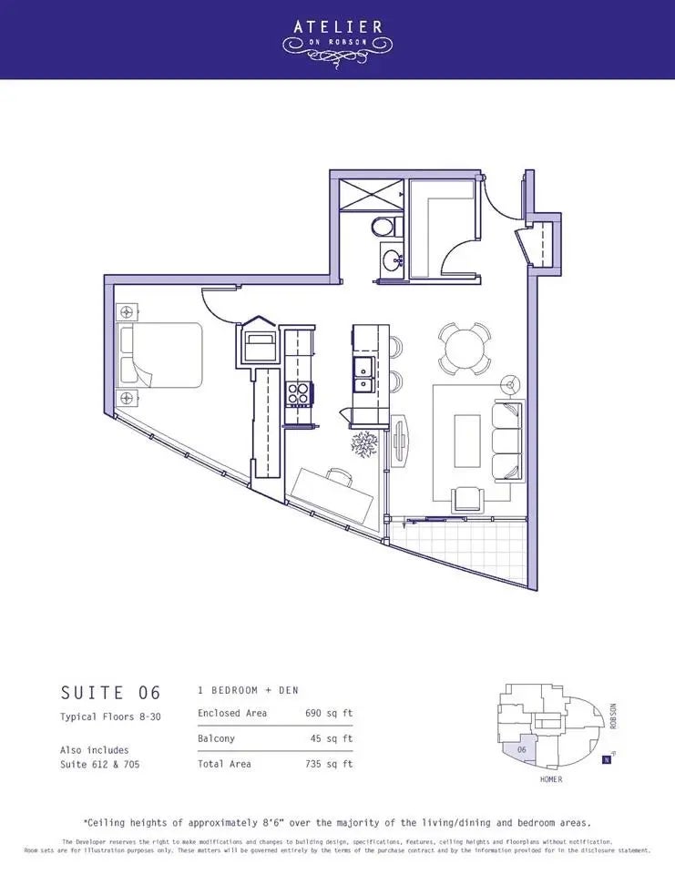 Welcome to the "Atelier on Robson" in the Vancouver downtown area. This one bedroom and den plus in suite storage and one bathroom, has high ceilings, great city views, stainless steel appliances, granite counter tops. Building has yoga studio, huge fitness centre, bike room, garden lounge, large outdoor space, playground and meeting room, sauna, party room and concierge. Price included one parking. Tenant at $3,038/month, lease will be expired on Feb 28, 2026. Finished floor area from BC assessment and in suite are measured by listing agent. All measurements are approximate, buyer to verify if deem important.