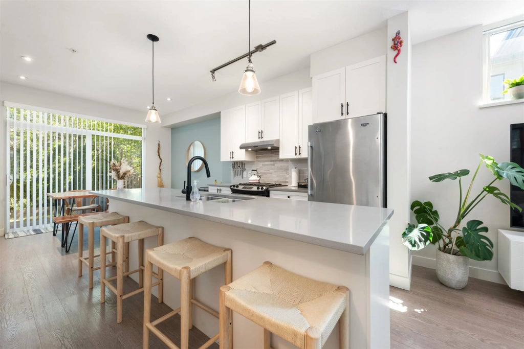Bright end-unit townhome in the sought-after Eaglewind community. The open concept main floor features 9 ft ceilings, oversized windows, and a natural gas fireplace. The kitchen is equipped with quartz counters, stainless steel appliances, updated lighting, and a large island with seating for four. From the dining area, step directly into your private, fully fenced backyard, ideal for kids, pets, or outdoor entertaining. Upstairs offers three bedrooms, two bathrooms, and full-size laundry. The spacious primary bedroom includes an ensuite with heated tile floors, and an oversized tub and shower. A huge tandem garage provides ample space for parking and storage.
