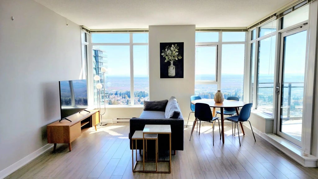 View Property & Fully Furnished. 2 bed & 2 full bath unit in the heart of Metrotown. Enjoy stunning panoramic SW views over Vancouver, Richmond, the Strait of Georgia, Mt. Baker, and Downtown Vancouver from every room. This 38th floor unit has a big covered patio to enjoy the views. Bedrooms have new queen beds, built-in closets, and privacy. Harwood floors in the living areas and carpets in the bedrooms. The kitchen features a gas stove, stainless steel appliances, and in-suite laundry. Located steps from Metrotown Mall and Skytrain. Monthly rent inclusive of utilities, wifi, parking, and gym amenities. Available NOW!