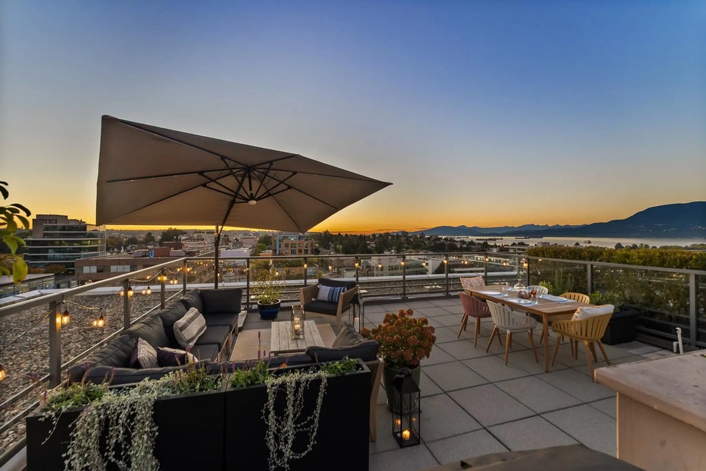 Penthouses in concrete buildings in Kits don't come up often - and this one checks every box. This 2 bed, 2-bath home with a bright solarium/office spans 1,042 sq ft inside plus an incredible 500+ sq ft private deck (built in outdoor gas fireplace) with sweeping views of the ocean, mountains & city skyline. Perfect for sunset cocktails, plant life or lazy Sunday brunches. Inside, an open concept kitchen, dining & living space makes entertaining easy and effortless. The second bedroom connects to a light-filled ofFice or creative nook - ideal for work-from-home or studio vibes. Every room feels spacious & calm, with natural light and those unbeatable views. Enjoy 2 parking stalls, a well-managed building with a gym, and a location that brings the best of Kits to your doorstep.