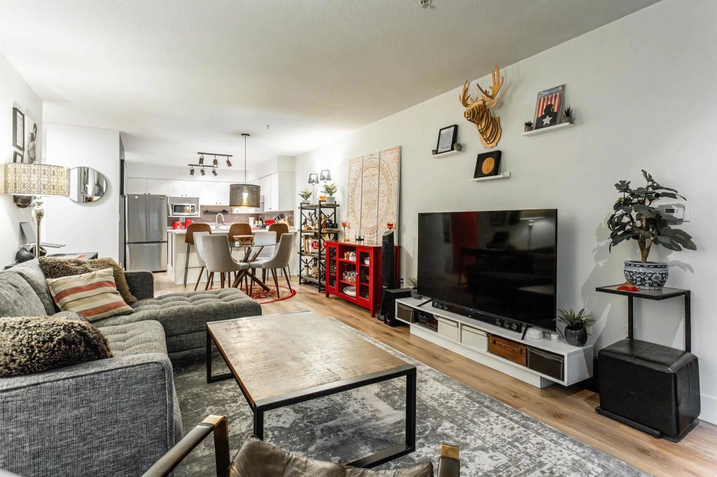 Welcome to Pacific Place! This extra spacious 807 sq ft 1-bedroom condo is upgraded throughout. Open concept living with upgraded laminate flooring, stainless steel appliances, gas fireplace, a wood feature wall in the bedroom with a large walk-in closet, laundry room with tons of storage, and a private covered patio for your outdoor enjoyment. Conveniently located just steps from the Evergreen Skytrain Line, Coquitlam Centre, and Lafarge Lake. Schools within easy reach include Glen Elementary, Maple Creek Middle, Pinetree Secondary, and Douglas College. Book your private appointment today.