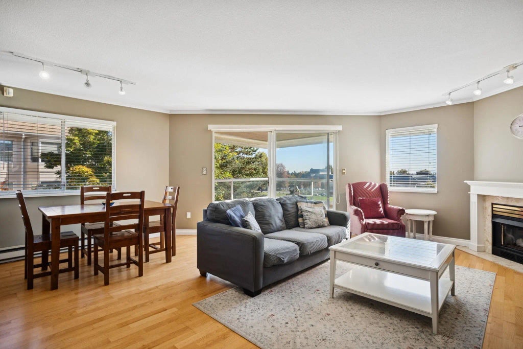 Discover this charming, top-floor floor corner unit 2-bedroom, 2-bathroom condo offering 1204 sq ft of living space. Southeast-facing views of the school fields from a covered balcony with lush green exposure is perfect for relaxing or entertaining. The open-concept layout features a spacious living and dining area, ideal for family gatherings with a cozy gas fireplace and electric baseboard heating. The functional kitchen features a breakfast bar, a nook, and a built-in pantry for ample storage. The primary bedroom boasts a skylight in the en-suite, ample natural light, and cork flooring for a soft, quiet feel, while the second bedroom is large enough for two. A laundry room with space for storage, as well as a separate locker downstairs, ensures plenty of space for your belongings.