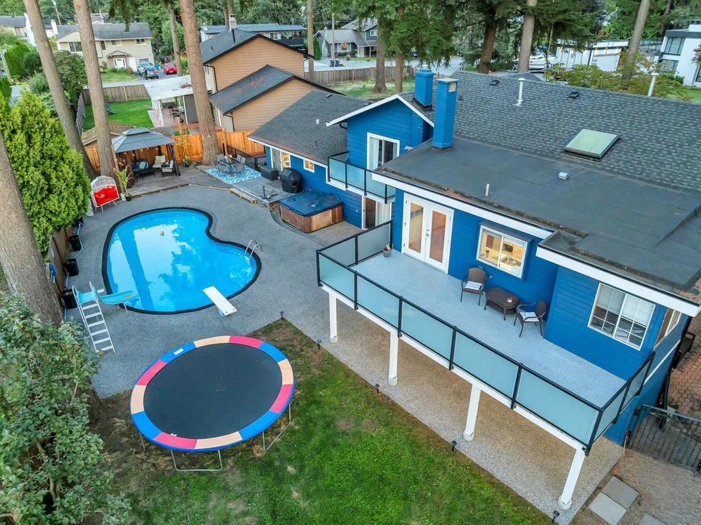 Welcome to Beautiful Brookswood! This 3 level split home (with mortgage helper) features a large yard with private inground pool. The home features a spacious family room, rec room, office, storage, 5-6 bedrooms, lovely kitchen with granite countertops. Tile & laminate flooring throughout. Newer vinyl windows. Double-car garage. Enjoy outdoor activities w/ Family & Friends: BBQ, swimming pool & trampoline! Spacious balcony, patio & decks w/ stunning greenspace view & sunsets. Separate carriage/coach house with own entrance and large private deck. CUL-DE-SAC. located in quiet neighborhood with easy access to ammenities.