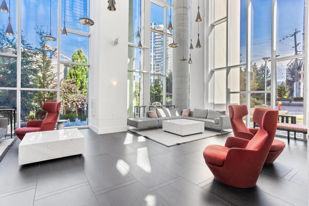 Stunning South-Facing 2 Bed, 2 Bath with Side-by-Side Parking! Experience the best floor plan in the building! This immaculate, like-new 2-bedroom, 2-bathroom unit features air conditioning and a highly desirable layout. Enjoy the convenience of an ensuite bathroom for the primary bedroom, plus a second bathroom conveniently located outside the other bedroom. Soaring 9-foot ceilings and expansive floor-to-ceiling windows showcase gorgeous city and mountain views, flooding the space with abundant natural sunlight. Premium Finishes Include: Stainless steel appliances, Quartz countertops , Custom cabinetry, Hardwood flooring. Situated in a supremely convenient location, steps away from shops, restaurants, and directly across the street from Burquitlam Station.