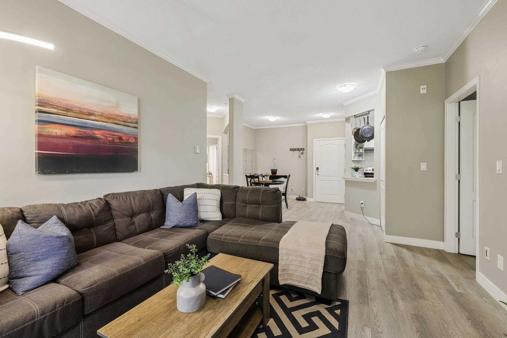 CORNER, GROUND Floor unit in sought-after City Grande! This 2Bdrm/2Bth is beautifully updated with wide-plank floors throughout PLUS new SS appliances in your bright kitchen w/double-sinks + ample storage. The generous Primary offers plenty of closet space + your private 3-pce Ensuite. Enjoy the abundant natural light, a cozy gas fireplace & private covered deck perfect for relaxing or entertaining. Convenient in-suite laundry space provides extra storage. Close to shops, cafes, near Lynnwood Park & upcoming SkyTrain. Well-maintained complex amenities include Exercise, Billiards & Rec rooms. Secure underground parking + storage locker. This condo is move-in ready!