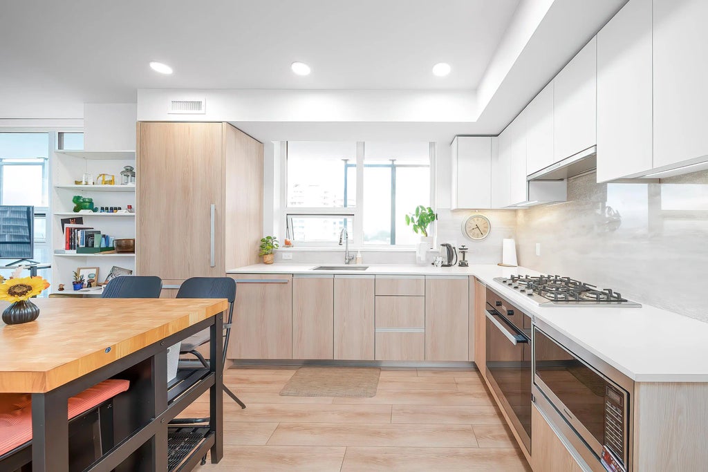 Bright 2-bdrm/2-bath, NE-corner 774sf unit at famous “One Park” in the heart of Richmond. Quiet, serene & super convenient shopping & transportation. Lux flr-to-ceiling windows; 8’6” ceilings; open kitchen featuring Miele gas cooktop, electric oven, panelled 30” fridge, & DW, Panasonic microwave, quartz countertops & 21sf walk-in pantry w/Blomberg W/D; laminate & tile flrs thru-out; + AC, heat pump & roller shades. Enjoy your 275sf wrap-around balcony w/views of north shore mtns, city & Mt Baker. 1 EV-ready parking + 1 bike locker. Extensive amenities: gym; sauna & steam rms; yoga, dance & table tennis rms; rec rm w/pool table; lounge w/chef's kitch; sound-proof music rms; + 31,000sf terrace w/garden plots, BBQ area, playgrnd & water feature. Pets & rentals friendly.