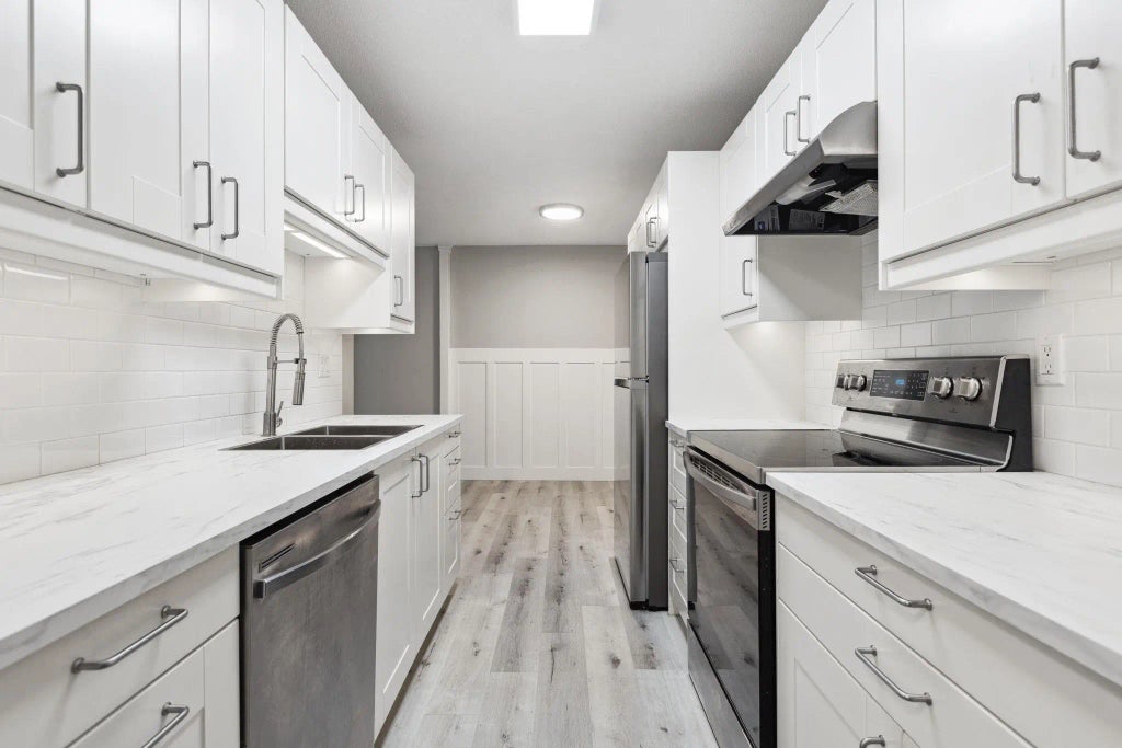 This move-in-ready home, centrally located in Ladner Village, was beautifully updated in 2021. It features new kitchen cabinets, appliances, and vinyl plank flooring throughout. The updated bathroom boasts a heated electric floor, a large bathtub, and a new vanity. Additional designer touches include fresh paint, 5" baseboards, wainscoting, and upgraded lighting. The unit offers convenient in-suite storage that can accommodate a washer and dryer. Enjoy a 150 sq. ft. semi-covered patio with all-season grey trek decking, surrounded by mature hedging for added privacy. Located on a quiet corner end, this home provides easy access to local shopping, schools, pools, and more. It has also recently been rain screened.