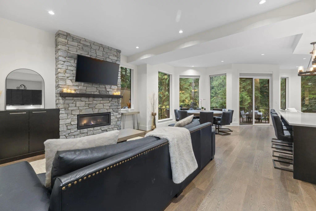 There’s living near the forest, and then there’s living in it. Just a 10 minute walk from Buntzen Lake, this custom modern home brings nature right to the glass line. Oversized windows frame tall evergreens, while warm wood and stone finishes wrap around two gas fireplaces. The chef’s kitchen features double ovens, one full fridge, one mini fridge, and one wine fridge. Spa bathrooms include glass showers and a deep soaker tub set beside forest views, perfect for quiet forest bath calm. A custom wine wall by a world renowned artist adds a striking focal point. Downstairs, a fully separate suite with its own kitchen, fridge, entry, and laundry offers true independence. Outside, decks, hot tub, and treed canopy create total retreat.