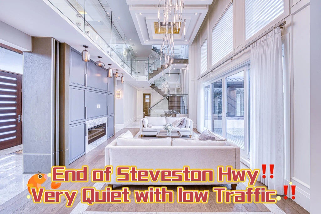 Luxury Living Near Steveston Village! This one-of-a-kind custom-built 3-Level home sits on huge 11,447 sqft South-facing lot. With 4,700 sqft elegant living space, it features 5 bedrooms, a den, a media room, and 6 bathrooms. Inside, enjoy soaring ceilings, hardwood and European tile floors, and crystal chandeliers. The gourmet kitchen includes Miele appliances, a breakfast bar, and a separate wok kitchen. Perfect for entertaining! A recreation room with a wet bar and sauna opens to a rooftop deck. Outside, a built-in BBQ patio makes outdoor living effortless. Modern comforts include A/C, HRV, a sound system, and smart home tech. Located steps from Dyke trails, parks, and Steveston Village, this home is luxury at its finest. Must See!