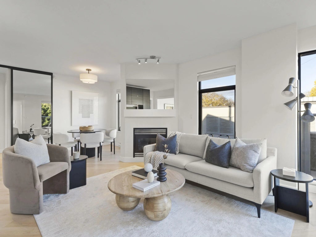 Unbeatable location in Arbutus Walk! This bright 2-bed/2-bath + den, 996 sq. ft. corner home at Solo is in excellent condition with stylish upgrades. Recently refinished maple floors, a dual-fuel stainless oven, Miele dishwasher, and LG refrigerator enhance the spacious open-plan kitchen and living areas. Large windows fill the home with natural light and showcase peaceful park views with mountain tops beyond. The primary suite features a walk-in closet and 3-pc ensuite; the second bedroom is generous in size. Enjoy excellent room separation, insuite storage, a large balcony, 2 parking stalls with EV charger, bike storage, gym, and amenity room. All just steps to parks, shops, schools, transit, and the Kits Farmer’s Market.